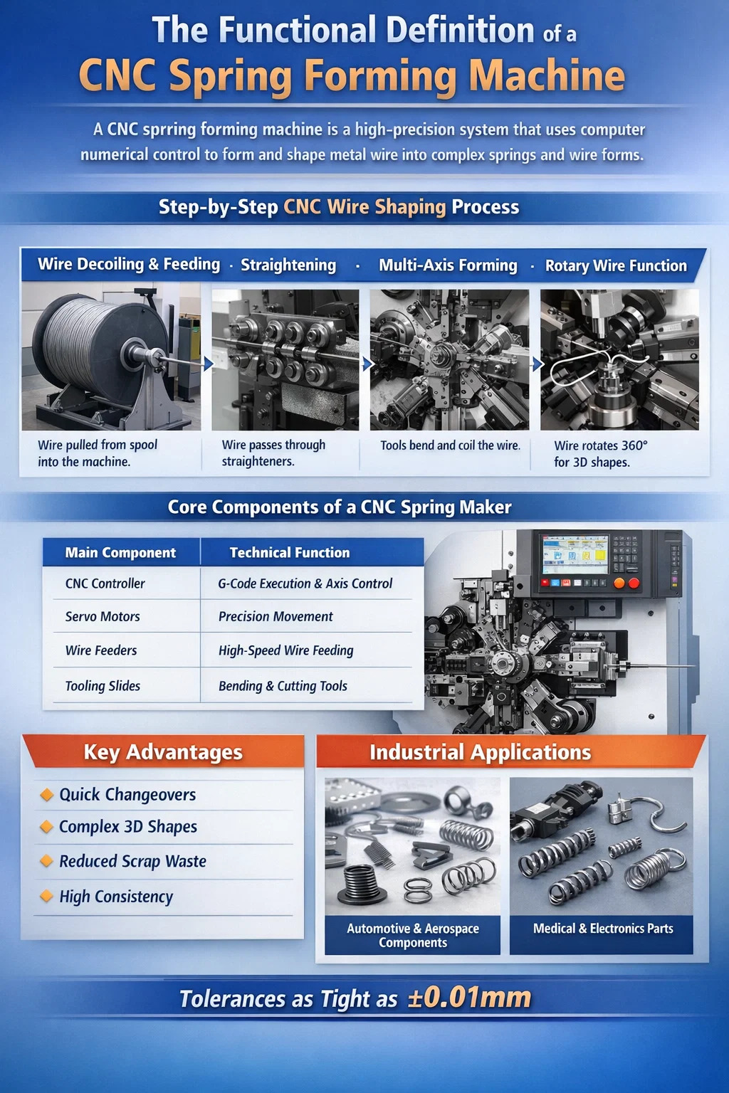 Berskala kecil Mesin pembentuk spring CNCs menghasilkan mikro-spring untuk modul kamera telefon pintar dan instrumen pembedahan. Pada skala ini, ketepatan mesin dalam mengendalikan wayar setipis 0.1mm adalah terpenting.
