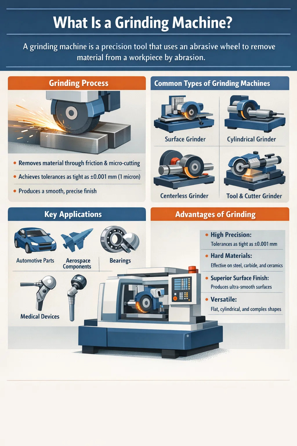 | Grinding | Bahan keras, kemasan ketepatan | ±0.001–0.005 mm | 0.1–0.8 µm | Rendah–Sederhana |