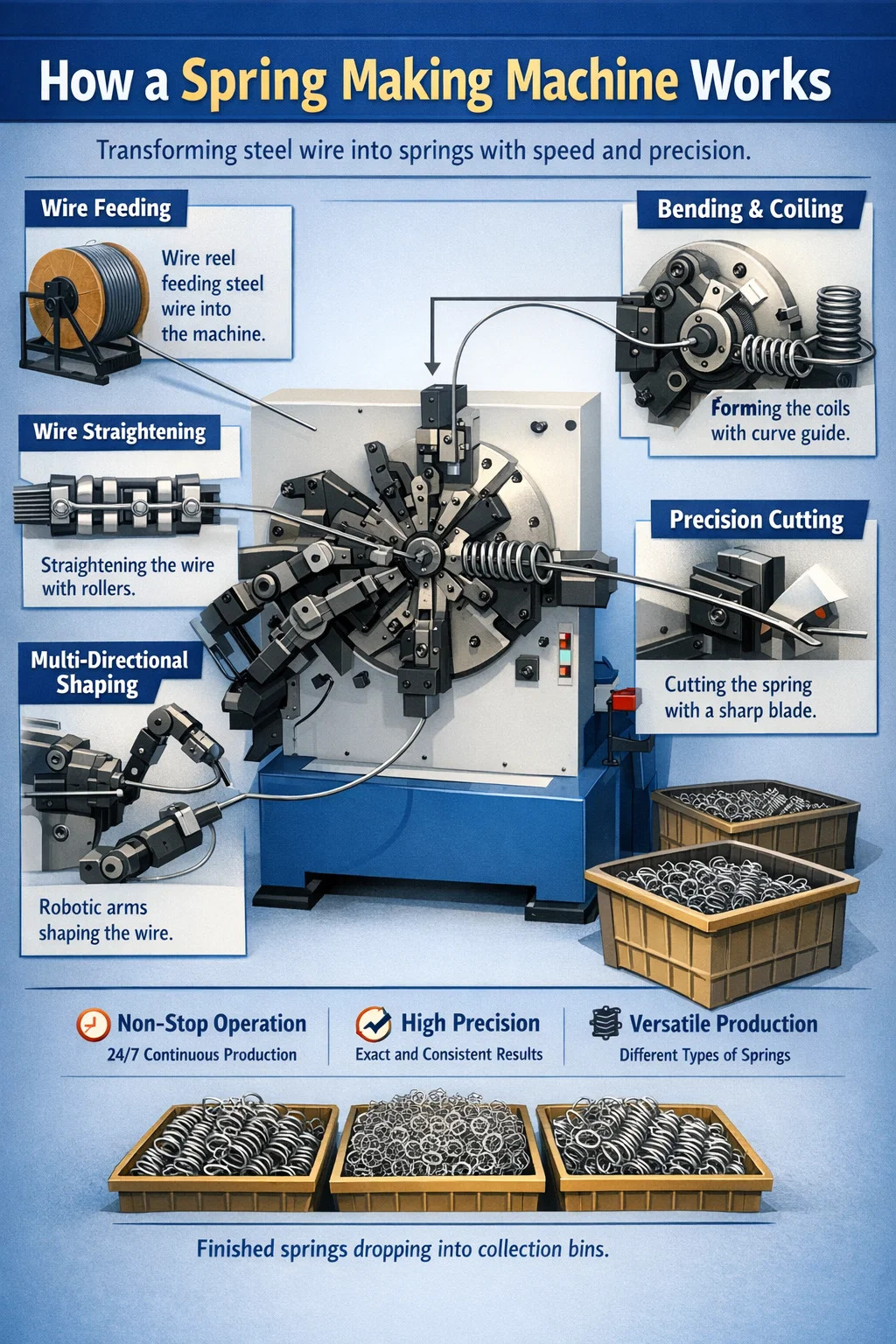 Selagi ada elektrik dan bahan mentah, mesin membuat spring boleh bekerja 24 jam sehari tanpa gangguan, mencapai kecekapan ratusan atau ribuan kali lebih tinggi daripada buruh manual.