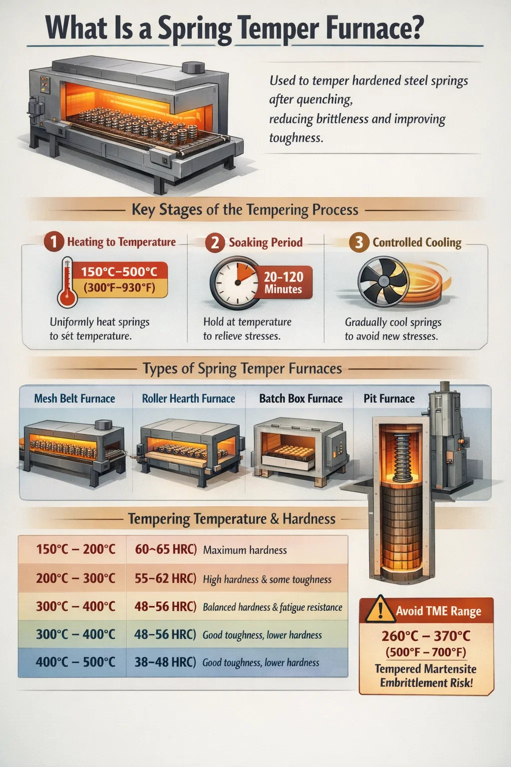 Relau temper spring ialah sejenis relau rawatan haba industri yang direka khusus untuk meredakan spring keluli selepas pengerasan. Tugas utamanya ialah memanaskan semula keluli spring yang telah dikeraskan kepada suhu terkawal - biasanya antara 150°C dan 500°C (300°F hingga 930°F) — tahan di sana untuk tempoh tertentu, dan kemudian biarkan ia sejuk dengan cara terkawal. Proses ini melegakan tekanan dalaman yang diperkenalkan semasa pelindapkejutan dan pengerasan, melaraskan kekerasan kepada julat yang ditentukan, dan memulihkan tahap keliatan dan keanjalan yang mungkin tiada dalam spring yang mengeras sepenuhnya.