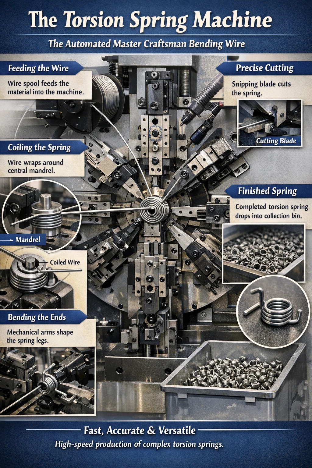 Jika anda pernah melihat penyepit pakaian kayu atau pangsi pintu automatik, spring di dalam dengan pusat bergelung dan dua "kaki" yang memanjang dari setiap hujung adalah ciptaannya. Mesin spring biasa mungkin hanya melilit bulatan ringkas, tetapi mesin spring kilasan bukan sahaja boleh melilit wayar tetapi juga membengkokkan hujung spring ke dalam pelbagai sudut yang kompleks, membolehkannya menyambung atau menyokong bahagian lain.