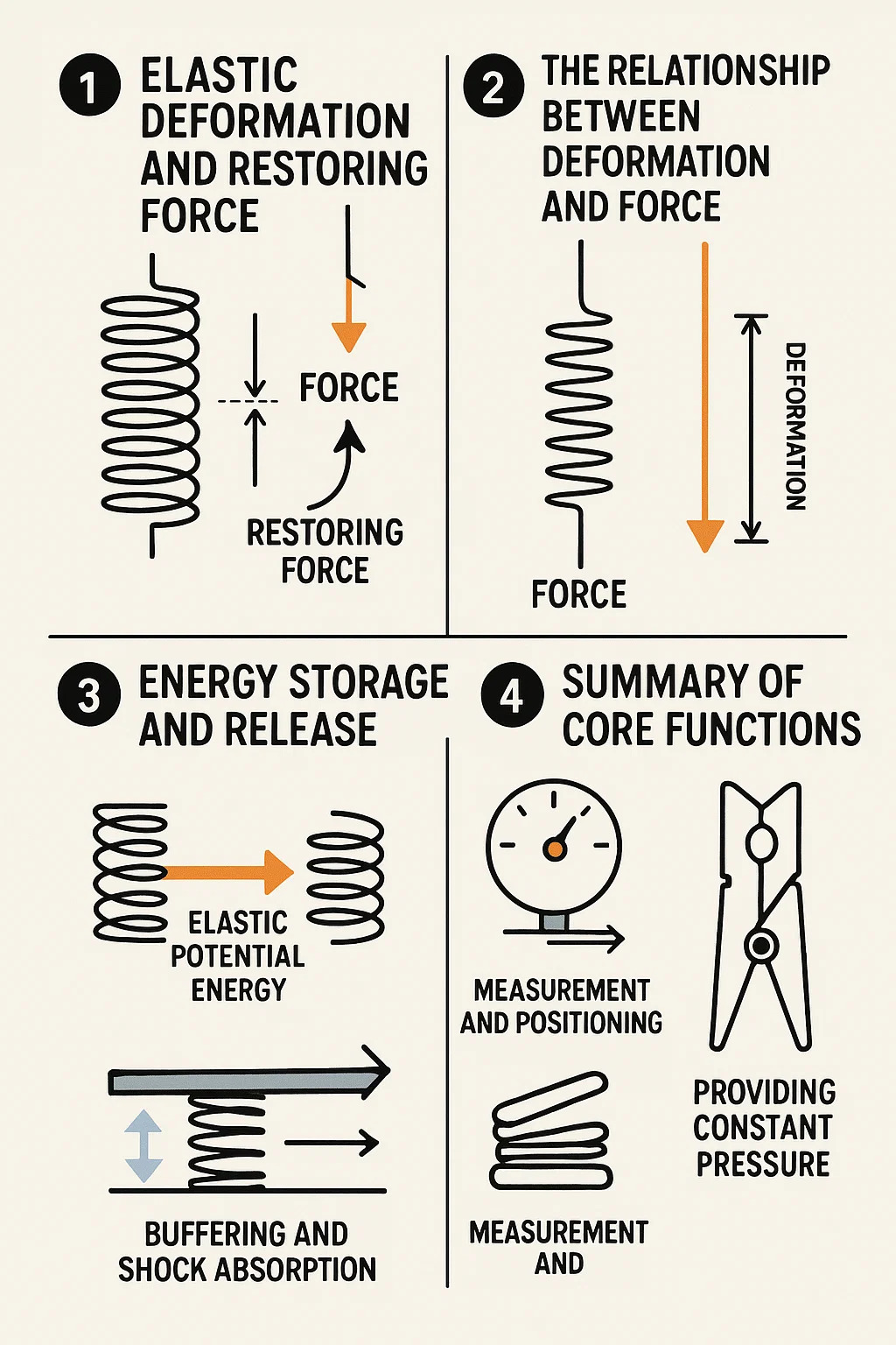 Penyerapan dan penyerapan kejutan: mata air dapat menyerap tenaga dari kesan dan getaran dan secara beransur -ansur melepaskannya dari masa ke masa, melindungi struktur (seperti sistem penyerapan kejutan kereta). Pengukuran dan kedudukan: Dalam skala, ubah bentuk musim bunga boleh digunakan untuk mengukur berat badan; Dalam banyak peranti mekanikal, ia digunakan untuk mengembalikan bahagian ke kedudukan awal mereka selepas kerja selesai (seperti dalam butang dan suis).