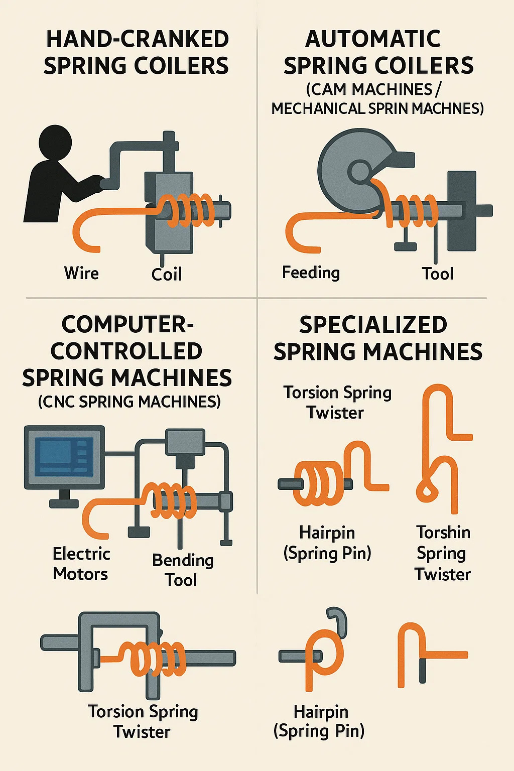 Semua mesin pembuatan musim bunga mengambil sekeping wayar logam yang panjang dan lurus dan bengkoknya berulang kali ke dalam bentuk yang betul atau berbentuk, kemudian potong panjang. Perbezaan utama adalah bagaimana mereka mengawal langkah -langkah lentur tersebut.